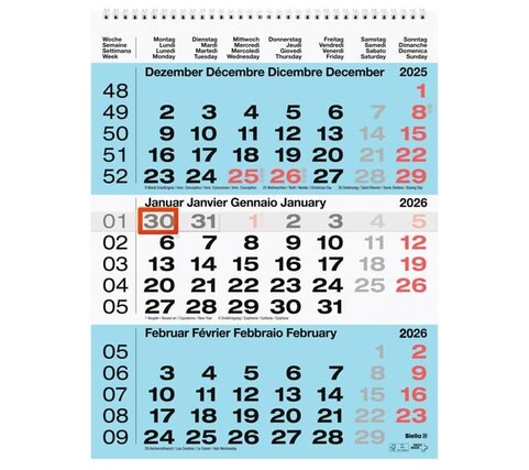 inkl. MwSt.3 Monate pro Seite. Spiralbindung (Wire-O), mit Aufhänger. Kalendarium d-f-i-gb, vorangehender, aktueller und Folgemonat. Druck schwarz/rot. Datumsschieber.