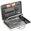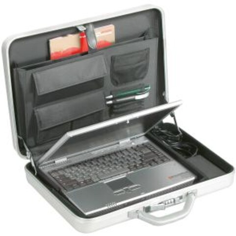 Aus edlem Aluminium, herausnehmbare Notebookpolsterungen, als Akten- und Notebookkoffer zu benutzen, mit abnehmbarem Schultergurt, Masse: 45 x 33 x 9 cm.