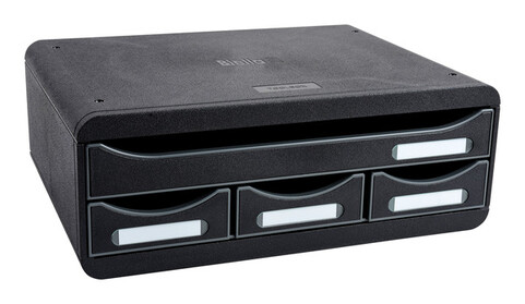 Biella Toolbox Mini mit 4 Schubladen. 1 Schublade für A4+ Formate und 3 schmale Schubladen für kleine Büro-Utensilien. Durch die geringe Höhe (13,5 cm) und Querformat vielseitig verwendbar, als Basis für Bildschirm, Kaffeemaschine, Drucker oder Desktopsorter. Federleichte Ladenführung mit einzigartigem Stopp-Mechanismus Etikettenhalter im Lieferumfang.