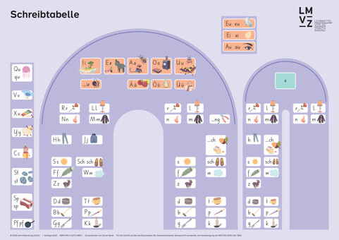Die Schreibtabelle im A4-Format wird wie eine Anlauttabelle verwendet und bildet zusätzlich noch die Verortung der Buchstaben in der Silbe ab.