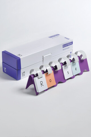 Das Wörtermodell aus langlebigen Materialien wie Blech und recycliertem Kunststoff enthält 180 Buchstabenkarten und wird in einer praktischen Box ausgeliefert.
