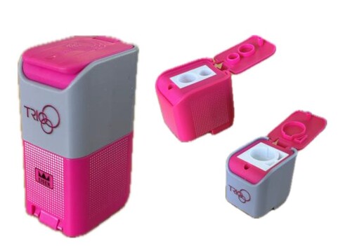 Dreifach Doppelspitzer mit zwei Auffangbehälter, eckig mit Deckel. Farbig assortiert: pink, blau gelb.