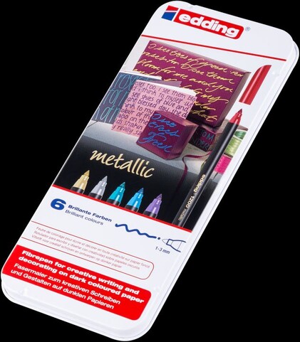 inkl. MwSt.Malen und Schreiben mit Metalleffekt, das können Sie mit dem EDDING 1200 metallic colourpen. Dieser Marker ist ideal, um auf dunklem Papier oder Pappe zu gestalten, sogar auf glatt beschichteten Papiersorten. Ob es persönliche Glückwünsche auf einer dunklen Karte sein sollen, die Beschriftung eines Foto-Albums oder ein mit Liebe gestalteter Kalender - fast jede Idee können Sie mit diesem Produkt unkompliziert umsetzen. Auch zum Schreiben oder Markieren eignet sich der EDDING metallic colourpen. Falls Sie Namensschilder oder andere Schriftzüge entwerfen wollen, die gut lesbar sind und dabei edel wirken sollen, greifen Sie zum edding metallic colourpen. Diese Farben werden in einer wassergelösten Tinte, durch ein Filtersystem in die Stiftspitze geleitet, wo sie dann beim Auftragen deckend und kräftig wirken. Die Farbe zeichnet sich nach dem Auftrocknen durch hohe Lichtbeständigkeit aus.