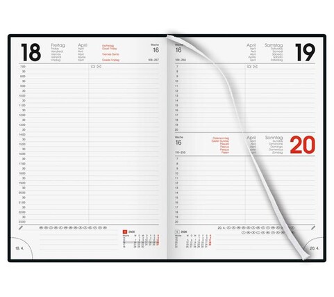352 Seiten 1 Tag pro Seite, Sa./So. auf 1 Seite. Einband Kunstleder wattiert, Zeichenband. Kalendarium d-gb-f-i-e-nl. Druck schwarz/rot. Stundeneinteilung 07.00-23.00, ½ Stunde. Jahres-, Monats- und Adressseiten. Jede Seite mit Monatsübersicht und Eckenperforation.