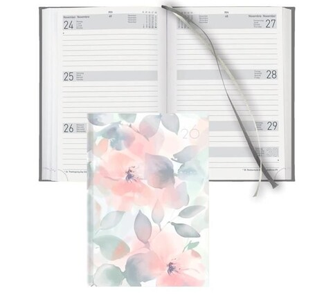 148 Seiten 3½ Tage pro Seite. Einband Papier bedruckt und laminiert, wattiert, Zeichenband. Kalendarium d-f-i-gb. Druck grau, Zweifarben-Optik. Jahres-, Monats- und Notizenseiten. Jede Seite mit Monatsübersicht und Eckenperforation.