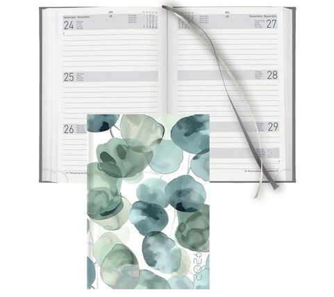 148 Seiten 3½ Tage pro Seite. Einband Papier bedruckt und laminiert, wattiert, Zeichenband. Kalendarium d-f-i-gb. Druck grau, Zweifarben-Optik. Jahres-, Monats- und Notizenseiten. Jede Seite mit Monatsübersicht und Eckenperforation.