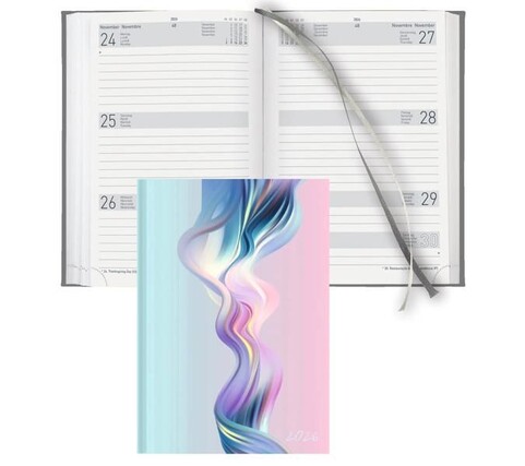 148 Seiten 3½ Tage pro Seite. Einband Papier bedruckt und laminiert, wattiert, Zeichenband. Kalendarium d-f-i-gb. Druck grau, Zweifarben-Optik. Jahres-, Monats- und Notizenseiten. Jede Seite mit Monatsübersicht und Eckenperforation.