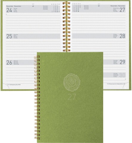 Die Geschäftsagenda Dispo Term Natural Wire-O von Biella ist eine durchdachte Planungsunterstützung für das Jahr 2027. Sie bietet eine praktische Wochenansicht auf zwei Seiten, die es ermöglicht, Termine und Aufgaben übersichtlich zu organisieren. Der Einband besteht aus Recyling-Pappe, was nicht nur umweltfreundlich ist, sondern auch eine ansprechende Haptik bietet.