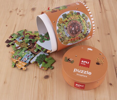 Kennenlernen der Biosphäre, entdecken von Tieren und Pflanzen, Förderung von Interaktion zwischen Kind und Erwachsenen. Puzzle-Durchmesser: 50 cm, Boxgrösse: 20 x 16 cm