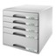 Aus Polystyrol | 4 flache Schubladen (34 mm) für die Aufbewahrung von Dokumenten, Prospekt- und Sichthüllen oder Jurismappen, 1 hohe Schublade (71 mm) für Schreibtischzubehör, z.B. Heftgerät, Mobilgeräte usw. | leichtlaufende Schubladen mit Auszugsstopp | mit ergonomischer Griffmulde für bequemes Öffnen | rutschfeste, möbelschonende Gummifüsschen | bis zu 3 Sets platzsparend stapelbar | inklusive Beschriftungsschildern und -haltern | Masse: (BxHxT) 287 x 270 x 363 mm.