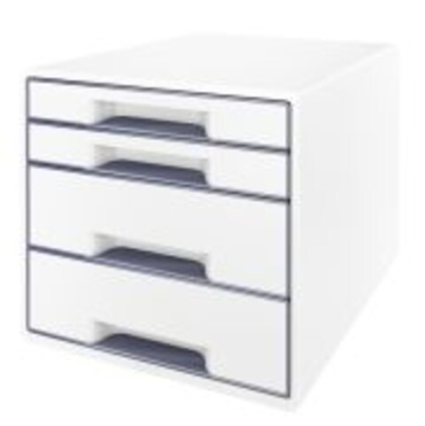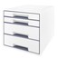 Aus Polystyrol | 2 hohe Schubladen (71 mm) für die Aufbewahrung von Kabeln, Zeitschriften und sogar Küchenutensilien oder anderem, 2 flache Schubladen (34 mm) für Dokumente und Büromaterial | leichtlaufende Schubladen mit Auszugsstopp | mit ergonomischer Griffmulde für bequemes Öffnen | rutschfeste, möbelschonende Gummifüsschen | bis zu 3 Sets platzsparend stapelbar | Lieferung inklusive einem weissen Stift, transparenten, aufsteckbaren Beschriftungsschildern und einem transparenten Schubladeneinsatz | Masse: (BxHxT) 287 x 270 x 363 mm.