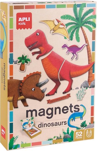 1 magnetische Bühne von 28 x 18 cm, die in den Boden der Box passt, und 52 Magnete mit den verschiedenen Teilen der Dinosaurier