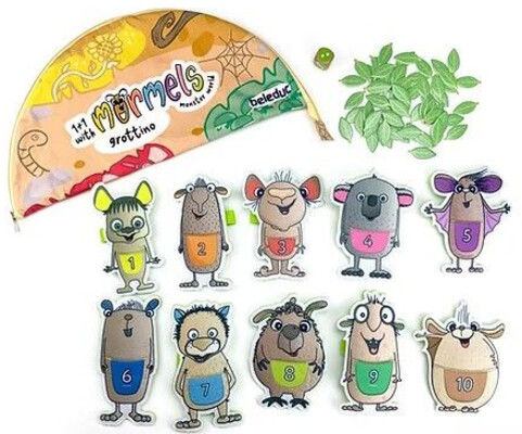 Die Mormels von 1-10 als Handpuppen, schön verpackt in einem Stoffbeutel mit Höhlenmuster. Die Mormels haben allesamt einen kleinen Beutel, in welchem sie die Blätter des Mamopi-Baumes sammeln können. Verpackt in Geschichten und Spiele lernen Kinder mit Grottino die Zahlen von 1-10 kennen, zählen, addieren und subtrahieren. Geeignet für Kindergarten und Grundschule, sowie für Zuhause. Auch für Rollenspiele geeignet.