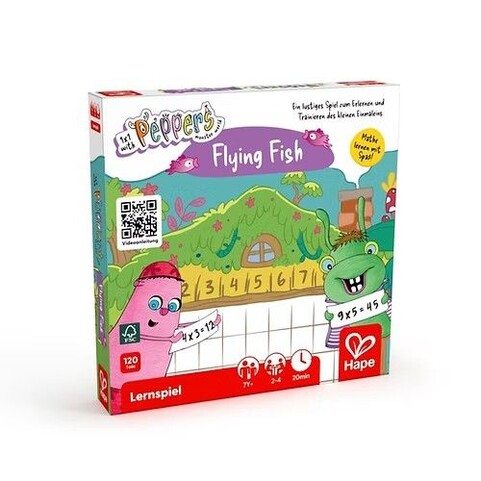 Dieses lustige Spiel mit Pantomime und wortreichen Erklärungen, ist ein gemeinsamer Wettlauf gegen die fliegenden Fische und eine vergnügliche Art das "Kleine Einmaleins" zu lernen. Um zu gewinnen müssen die Spieler Einmaleins-Rechnungen knacken. Dank verschiedenen Schwierigkeitsstufen ist Flying Fish sowohl für Einmaleins-Anfänger wie auch für Könner super geeignet. So macht Mathe lernen Spass!