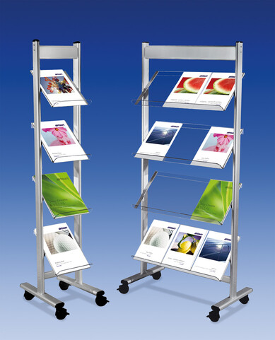 Stabile Konstruktion aus Flachovalrohr mit einer 80 mm hohen Beschriftungsblende. Fahrbar auf feststellbaren Zwillingslenkrollen. Material: Stahl / Acryl; Farbe: alusilber / transparent; Höhe: 1.600 mm; Tiefe: 350 mm; Fülltiefe: 40 mm; Anzahl der Ablagen: 4 Breite: 310 mm