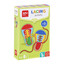 Stabile Kartonbox in Hausform, 4 Schuhkarten, 2 Paare, 4 Schnürsenkel in verschiedenen Farben, 1 Anleitungsblatt, Kartonbox Boden mit Inhaltsauflistung.