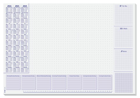 Schreibunterlage mit aktuellem 3-Jahres-Kalendarium, in hoher Papierqualität. Die stabile Leimung an der Unterkante und partiell an der Oberkante verhindert zuverlässig ein Umknicken der Ecken. Sichere Planlage durch stabilen Rückendeckel.