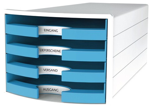 Schubladenbox IMPULS in moderner Optik mit 4 geschlossenen großzügigen Schubladen für Papierformate DIN A4/C4. Innovatives, attraktives Design in höchster Qualität. Inkl. großer auswechselbarer Beschriftungsschilder für ein einfaches Auffinden von Unterlagen. Leichtlaufende Schubladen mit Auszugssperre und durchgängig geschlossenen Boden auch zur Kleinteile Organisation geeignet. Extra stabiles Gehäuse aus einem Stück gefertigt. Stapelbar, dadurch Platz sparend. Rutschfeste, möbelschonende Gummifüße sorgen für einen sicheren Stand.