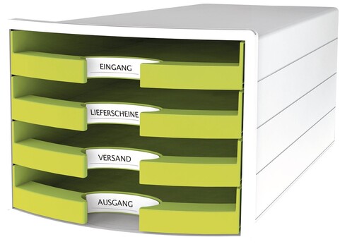 Schubladenbox IMPULS in moderner Optik mit 4 geschlossenen großzügigen Schubladen für Papierformate DIN A4/C4. Innovatives, attraktives Design in höchster Qualität. Inkl. großer auswechselbarer Beschriftungsschilder für ein einfaches Auffinden von Unterlagen. Leichtlaufende Schubladen mit Auszugssperre und durchgängig geschlossenen Boden auch zur Kleinteile Organisation geeignet. Extra stabiles Gehäuse aus einem Stück gefertigt. Stapelbar, dadurch Platz sparend. Rutschfeste, möbelschonende Gummifüße sorgen für einen sicheren Stand.