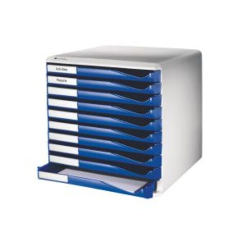 Post-Set mit 10 Schubladen aus Polystyrol, Innenmass Schubladen: B x H x T 251 x 22 x 323 mm, grosse auswechselbare Beschriftungsschilder, rutschfeste und möbelschonende Gummifüsschen, für Formate A4 und grösser, max. Stapelhöhe 3 Sets, Schubladen mit Auszugssperre damit sie nicht herausfallen können, mit Schubladeneinzug für sauber und ordentlich geschlossene Schubladen, Griffloch im Schubladenboden für einfache Entnahme des Schriftguts.