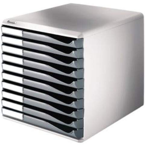 Post-Set mit 10 Schubladen aus Polystyrol, Innenmass Schubladen: B x H x T 251 x 22 x 323 mm, grosse auswechselbare Beschriftungsschilder, rutschfeste und möbelschonende Gummifüsschen, für Formate A4 und grösser, max. Stapelhöhe 3 Sets, Schubladen mit Auszugssperre damit sie nicht herausfallen können, mit Schubladeneinzug für sauber und ordentlich geschlossene Schubladen, Griffloch im Schubladenboden für einfache Entnahme des Schriftguts.