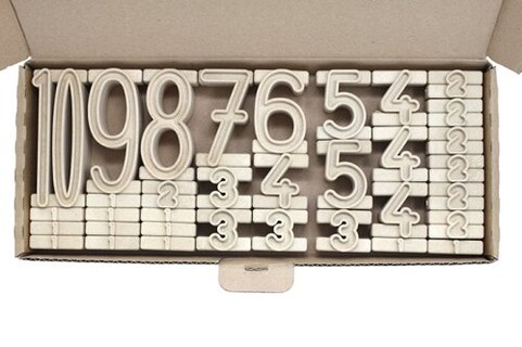 Satz aus 34 Stapelzahlen aus RE-Wood®. 12 x 1, 7 x 2, 4 x 3, 4 x 4, 2 x 5, 1 x 6, 1 x 7, 1 x 8, 1 x 9, 1 x 10 ermöglicht 10 x den Wert 10 mit unterschiedlichen Stapelzahlen zu stapeln. Der Wert der Stapelzahlen entspricht der Höhe in Zentimeter. Alle Zahlen sind 4 cm breit und 3 cm tief. Inklusive Kontrolllineal und Anleitung.