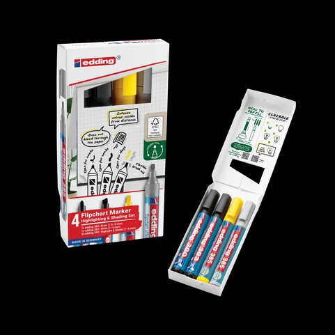 Alles, was Du für Flipcharts brauchst, in einem Set. Das Set enthält edding 385 Flipchart Effektmarker in gelb und grau für Hervorhebungen und Schattierungen, den edding 380 Flipchartmarker in schwarz für Visualisierungen und den edding 383 Flipchartmarker in schwarz zum Schreiben.