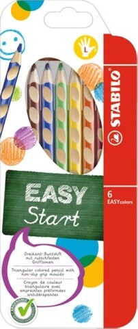 Ergonomischer Buntstift STABILO® EASYcolors Etui . Ausführung der Schaftform: Dreikantform. PEFC Lindenholz. Schaft lackiert . Größe (Ø x L): 9 x 175 mm. Für Rechtshänder - sichtbar durch roten Farbcode am Stiftende. Dreikantform und rutschfeste Griffmulden für eine entspannte Handhaltung. In Holz aus nachhaltiger Waldwirtschaft. Mit Namensfeld. Stärke der Mine: 4,2 mm. Schreibfarbe der Mine: sortiert. Ausführung des Inhalts mit Packung: Klappetui mit 6 Stiften.