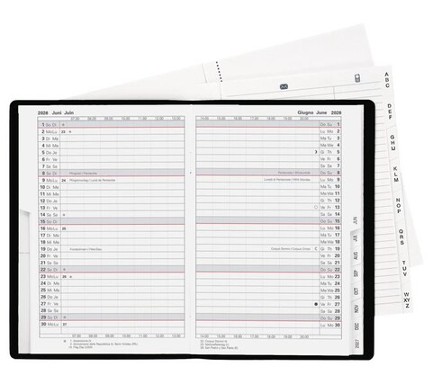 inkl. MwSt.40 Seiten 1 Monat auf 2 Seiten. Etui Kunststoff. Kalendarium d-f-i-gb, 15 Monate Oktober-Dezember, Druck grau/rot, Stundeneinteilung 07.00 - 20.00, 1 Stunde, drahtgeheftet, Registerschnitt. 16 Seiten Adressenregister und 16 Seiten Notizpapier.