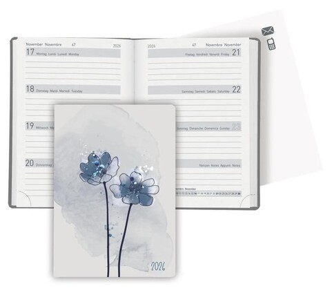 inkl. MwSt.Einband farbig-marmorierter Überzug, Inhalt weisses Papier liniert, Druck schwarz/grün, Kalendarium 4-sprachig d/f/i/e, zusätzlich Jahres- Monats- und Notizseiten, Adressregister, Informationen und Eckenperforation