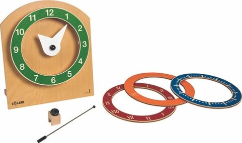 Die Kinder bauen mit den Solaris-Uhr-Komponenten ihre eigene Uhr. Die Uhr verfügt über verschiedene, austauschbare Zifferblätter (arabisch, römisch, Sonnenuhr).