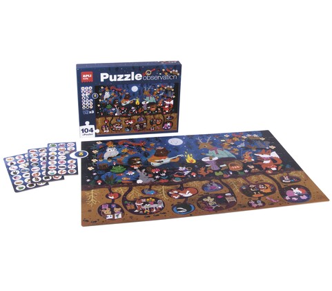 Stabile Kartonbox, 104 Puzzleteile 5 x 5 cm, 3 Teile mit Tiere mit Tieren, Pflanzen & Gegenständen zum Suchen, mit Poster des fertigen Puzzles in Originalgrösse, Kartonbox-Rückseite mit Inhaltsauflistung und Erklärung.