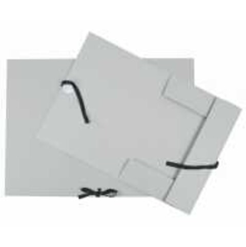 Preisgünstige Zeichenmappe aus dünnem Graukarton, mit 3 seitlichen Klappen, mit 1 Bändel auf der Längsseite, ohne Schild.